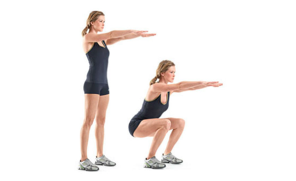 Em pé, mantendo a postura ereta e os pés afastados na largura dos ombros, realize o agachamento, mantendo sempre o quadril e os joelhos flexionados. Contraia os músculos da região abdominal e desvie o esforço para as pernas, de modo que os joelhos fiquem logo acima dos dedos dos pés. Não esqueça que durante o movimento, o quadril deve ser flexionado para trás, inclinando o tronco.