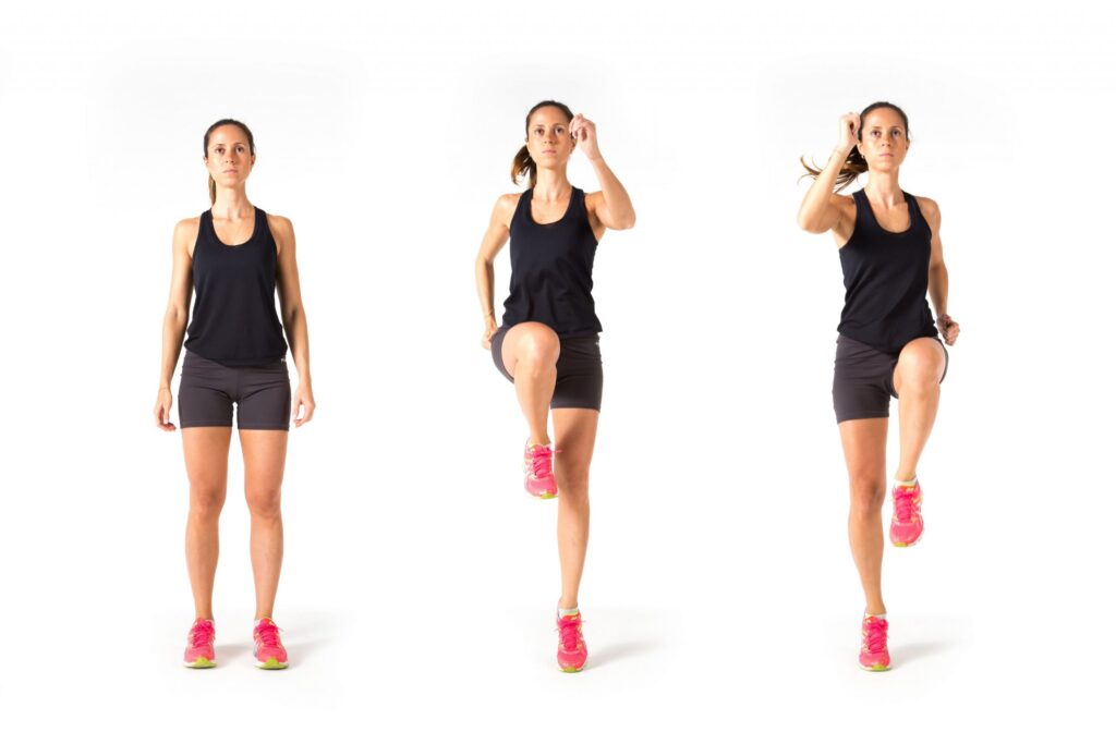Inicie a corrida de maneira suave sem sair do lugar, sincronizando com a movimentação simultânea dos braços; aumente a velocidade e eleve os joelhos até a altura do quadril rapidamente.