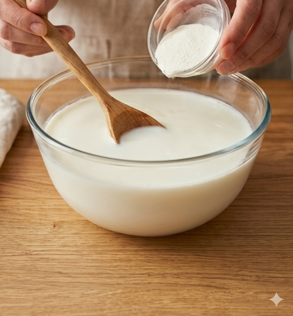 PASSO 3 – Inoculação: Misture o iogurte natural no leite morno delicadamente.
