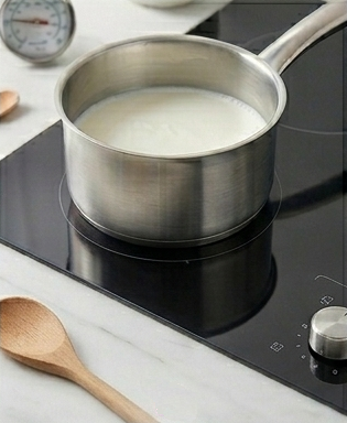1. Aquecimento: Aqueça o leite até quase ferver (cerca de 80°C). Se não tiver termômetro, desligue quando começar a subir aquelas bolinhas nas laterais.