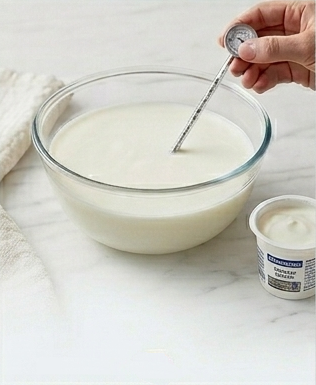 2. Resfriamento: Deixe amornar. O ponto certo é quando você consegue manter o dedo limpo no leite por 10 segundos sem se queimar (cerca de 45°C).