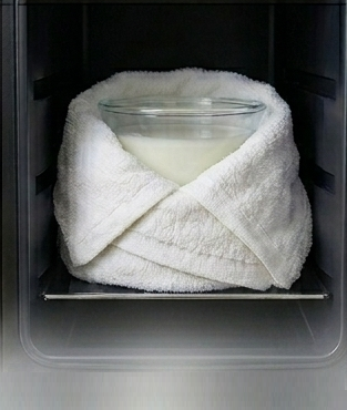 PASSO 4 – Descanso: Coloque em um recipiente, tampe e envolva em um pano de prato grosso. Guarde dentro do forno desligado ou micro-ondas por 8 a 12 horas.