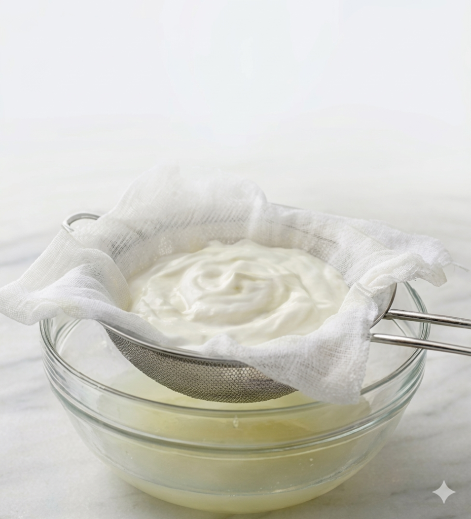 PASSO 5 – A Transformação (O Pulo do Gato): Forre uma peneira com um pano de prato limpo (ou filtro de café) sobre uma tigela. Despeje o iogurte e leve à geladeira por 4 horas. O líquido que cair é o soro; o que ficar no pano é o seu Iogurte Grego Real.